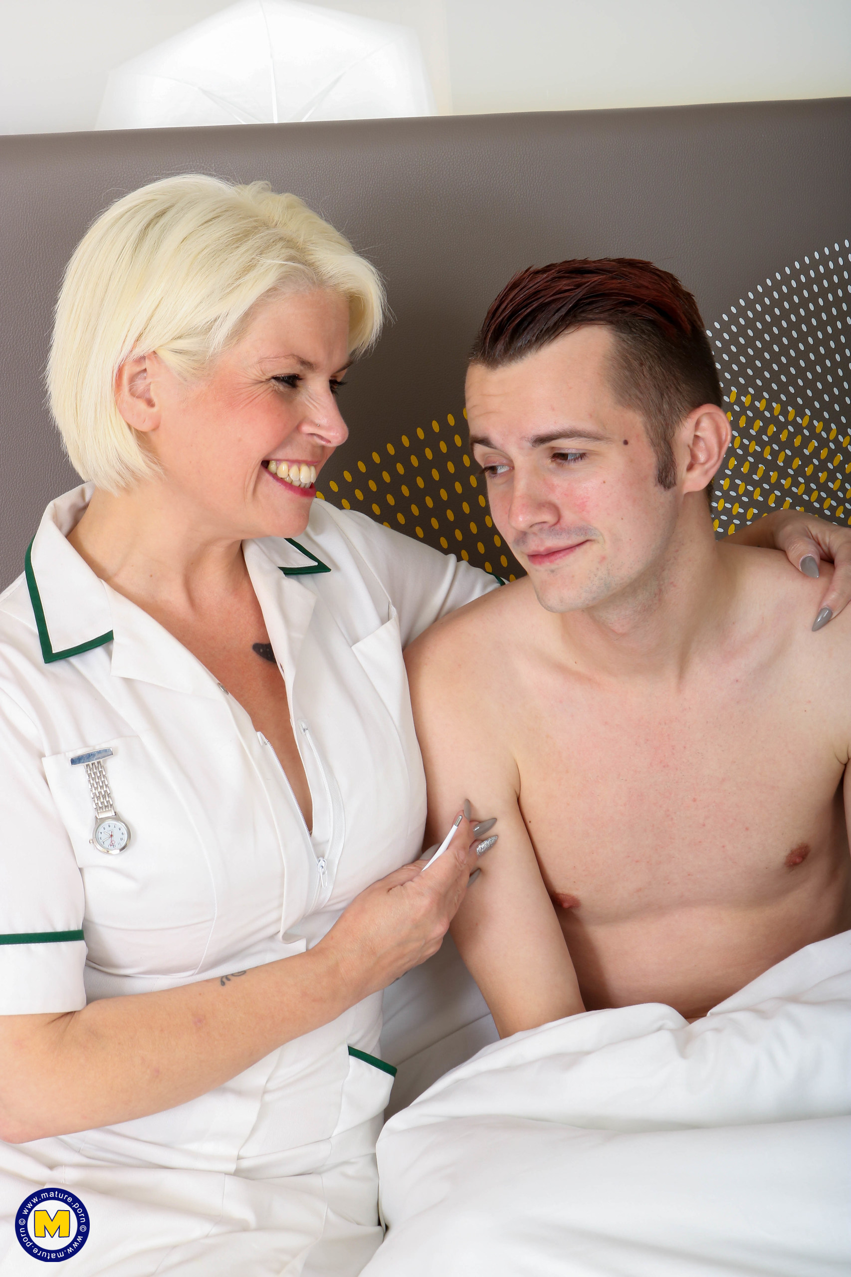 Mature blonde nurse lures young patient into spontaneous sex on bed