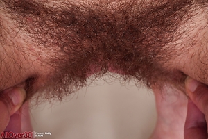 Hairy pussy babe spreads wide on kitchen stool showing her bush